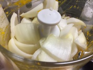 次は 玉ねぎです。 荒く切った玉ねぎも フードプロセッサーに入れます。