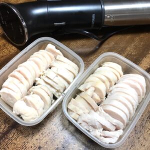 そうすると お湯が冷めるまでの 間にゆっくりと 鶏胸肉に火が通り しっとりやわらかい「鶏ハム」が 出きる。と言うことですが、一旦 沸騰したお湯に浸けることで、お肉のたんぱく質が固まって 低温調理器で、作ったものと比べると やや硬い。という印象です。