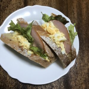 それが こんな感じです♪ ちょっとさまになりました(笑) 軽く焼いて具材を挟んだので、パン生地が ボソボソなのは 強く気にならなかったです。