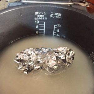 いつも通り、お米を炊くように 準備し、生の卵をさっと洗って、アルミホイルで包んで 生のお米の上に乗せます。