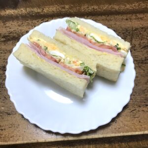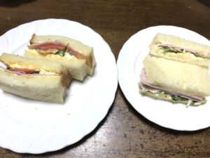 そして このパンで 今朝作ったのが、サンドイッチです。それは こんな感じで、出来上がりました。